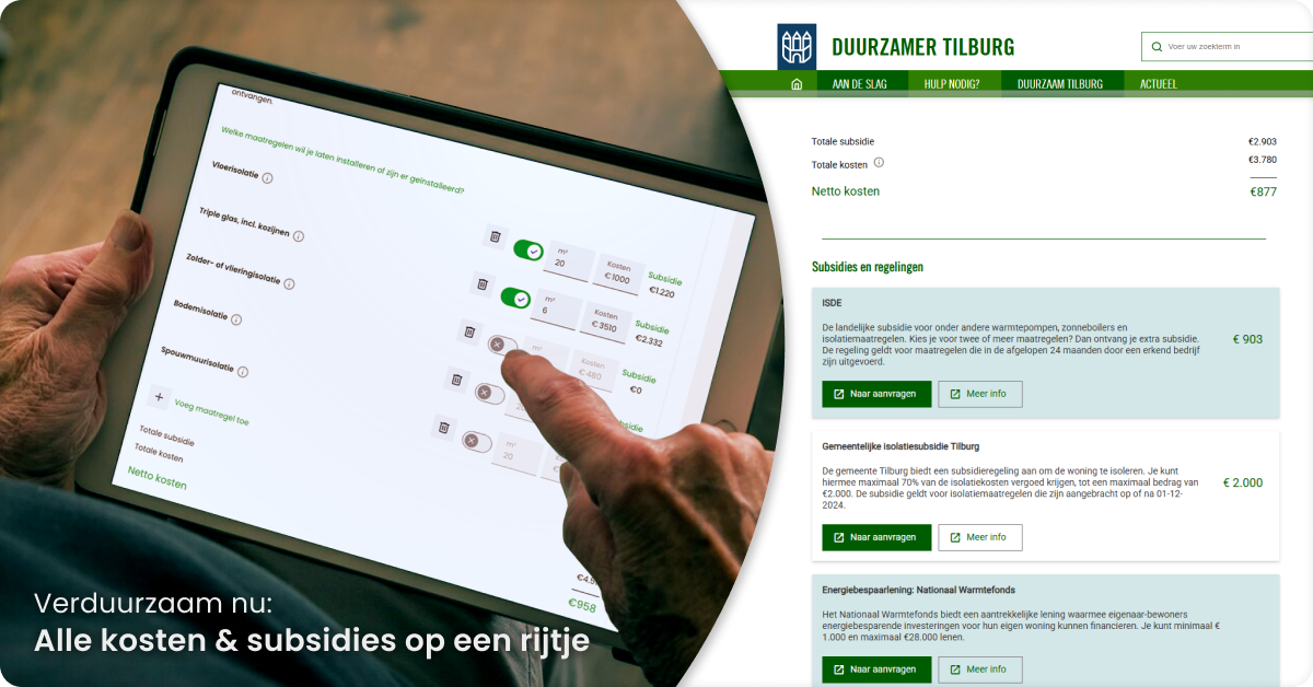 Steeds meer inwoners willen hun woning verduurzamen. Maar in de wirwar van landelijke en lokale subsidies, regelingen en leningen, weten veel mensen niet waar ze moeten beginnen. Daarom gaat de Gemeente Tilburg haar inwoners ontzorgen en actief stimuleren om te verduurzamen: door direct inzicht te bieden in isolatiekosten en subsidies.