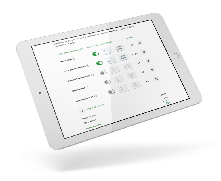 - Lage klantactivatie: zonder concreet inzicht over het bedrag dat de bewoner echt krijgt blijft verduurzaming achter. Accuraat inzicht in subsidies is de katalysator.